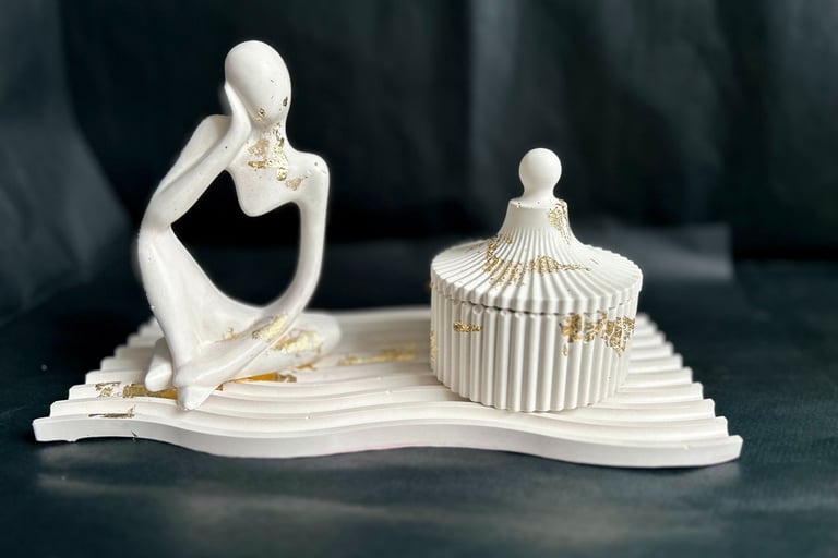 Rankų darbo interjero detalės puikiai papildo erdve, suteikdamos jai individualumo ir šilumos. Padėkliukai, puošnios žvakidės, bei statulėlės atspindi unikalų stilių. Kiekvienas elementas padarytas rankomis. Žvakės ant padėkliukų skleidžia šilumą, o meniškos statulėlės prideda gyvybės ir charakterio. Šios detalės sukuria subtilų, bet jaukų interjero akcentą.